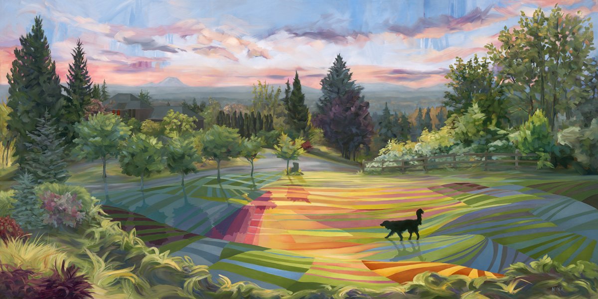 I love to portray narratives through a cast of characters in unexpected contexts, and to create the worlds they inhabit with graphic blocks of color, something now known as Ninaland. I find intrigue in translating traditional landscapes and backgrounds into fractured geometric fields, using color to communicate temperature and mood. Painting as a form of storytelling is my passion, and ultimately what inspires me to continue studying the masters while guarding the original style that beats within my soul.